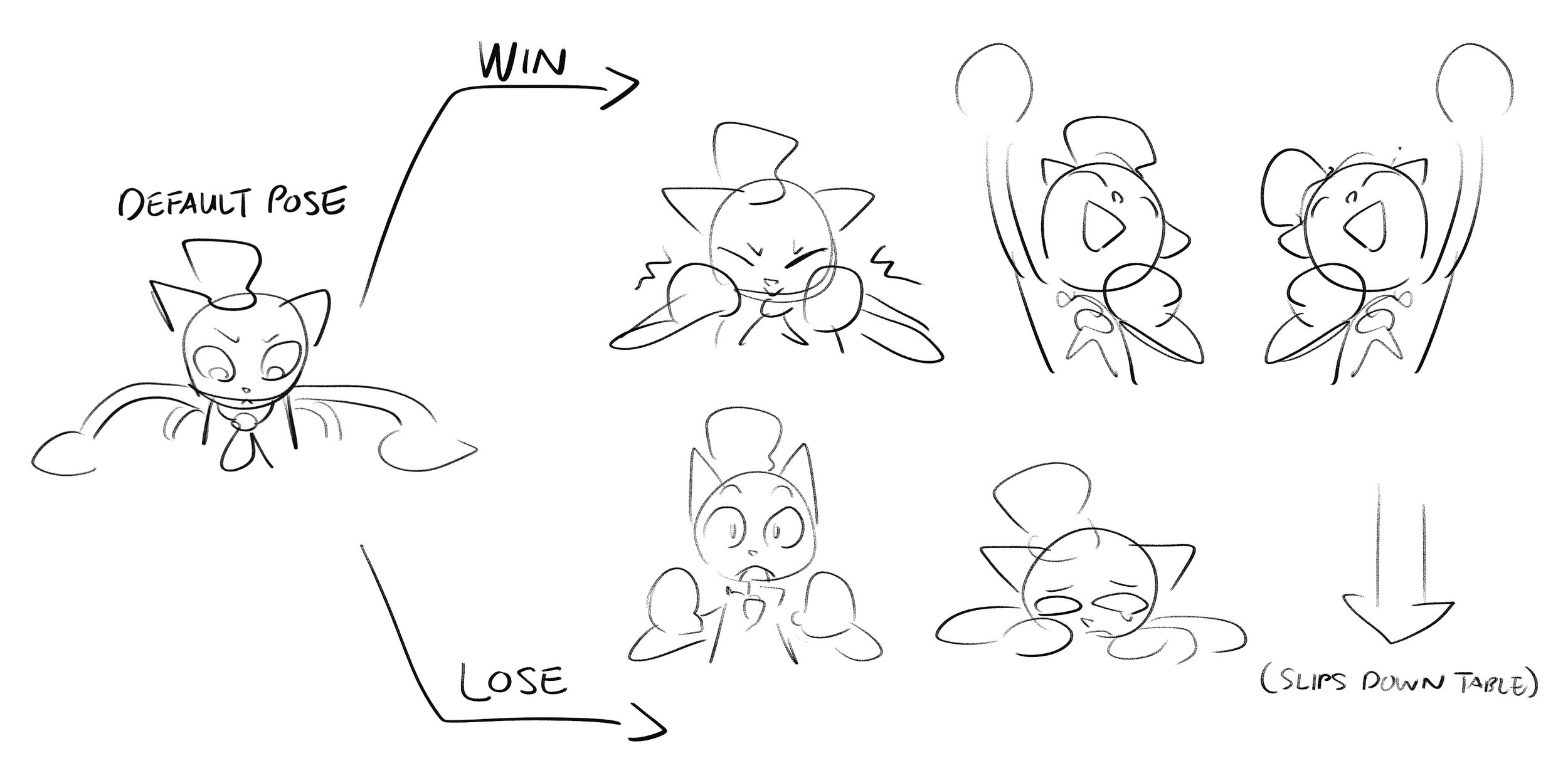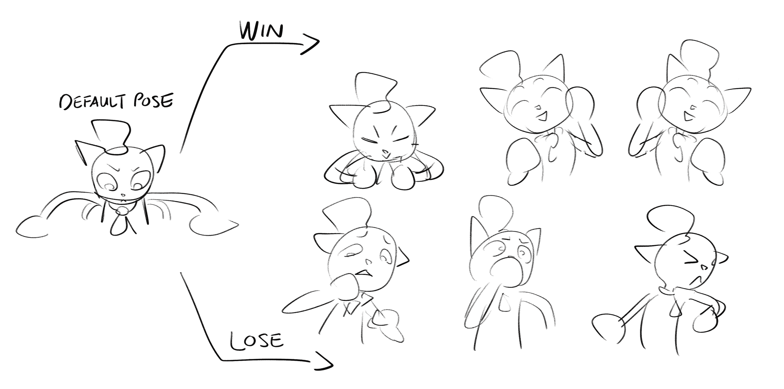 Once the player character design was finalized, I sketched a few sets of thumbnails to plan out different animation loops for win/lose states.
